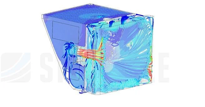 Per cliente del settore ventilazione si è analizzato il flusso all’interno di uno scambiatore di calore, ottimizzando la posizione della girante rispetto lo scambiatore, in modo da ottimizzare il flusso termico e migliorare le performance.