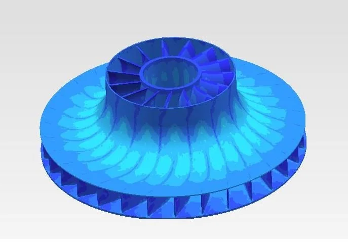 Per cliente del settore turbomacchine si è analizzata la distribuzione dei carichi sulla struttura della girante, con una analisi FEM in cui si sono applicati i carichi centrifughi e le pressioni fluidodinamiche sulla palettatura. Si è quindi studiata la vita a fatica della girante.